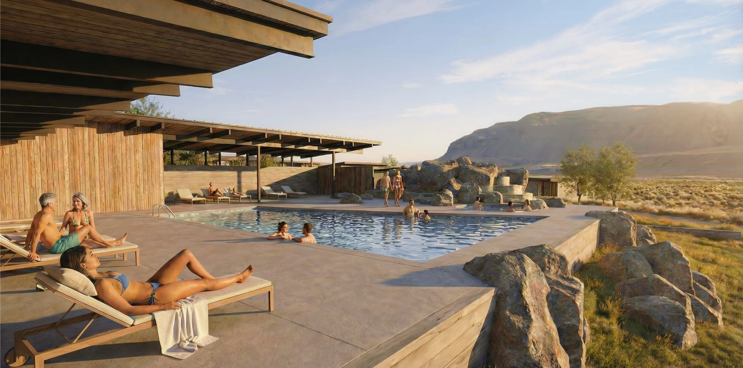 The future community is anchored by a pool, wellness center and coffee/pastry shop with outdoor seating